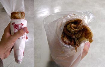 餅粉をベースにしたチヂミのような生地にイカのげそが入ってて、焼かれたそれにソースがべったり塗られて、クルクルッと巻いて渡してくれる。